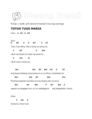 Wala ka ahh Bm7 Cm D E A Kulang ako kulang ako kung wala ka. G DF SA UMAGA PAG-KAGISING Em Dm G NGALAN MOY PUPURIHIN C G D PUSO KOY LAGING MAY-AWIT PARA SA YO G DF LAGI KONG NARARANASAN Em Dm G KATAPATAN MONG WALANG HANGGAN C G PAG-IBIG MOY LAGING SARIWA D Dsus4 SA. Di Ako Magsasawang Purihin Ka Key CC Di Ako Magsasawang Purihin Ka Key C C Intro.