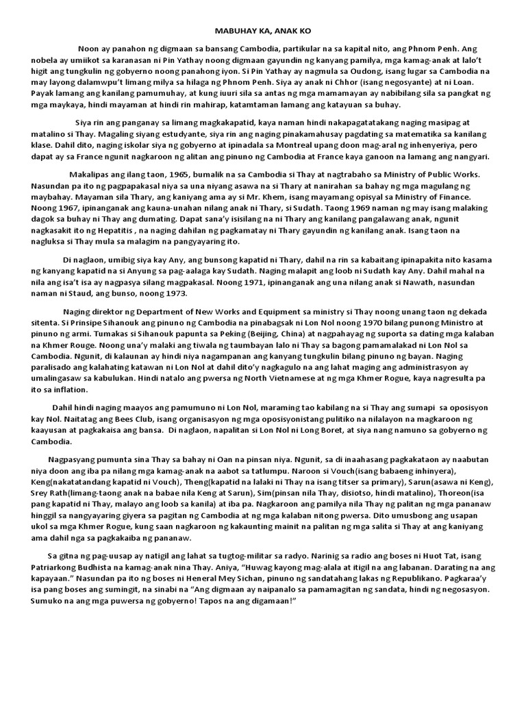 Mabuhay ka anak ko by pin yathay buod. Noon ay panahon ng digmaan sa bansang Cambodia partikular na sa kapital nito ang Phnom Penh. Habang nakahigay namalayan ko ang ibang pang ingay. Ngalngal ng mga kotseng.