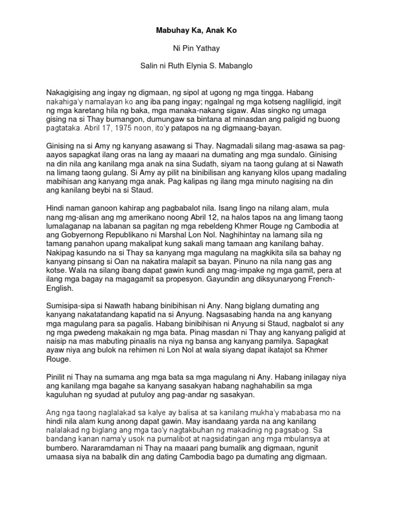 MABUHAY KA ANAK KO ni Ruth Elyna S. Mabuhay ka anak ko Pin Yathay. MabangloBuodNakagigising ang ingay ng digmaan ng sipol.