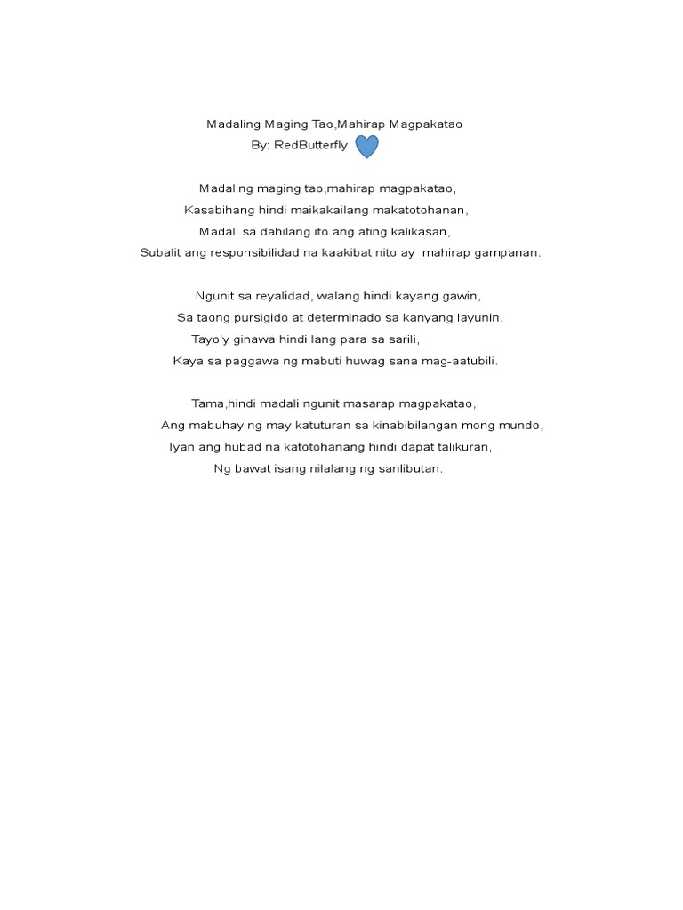 Madaling maging tao mahirap magpakatao in english. Magpakatao Madaling Mahirap Tao Essay Maging Checker I have listed my ideas Madaling Maging Tao Mahirap Magpakatao Essay Checker for what can be included in each section. - habang lumalaki ang tao at ng dahil. Humanity is common to all men.