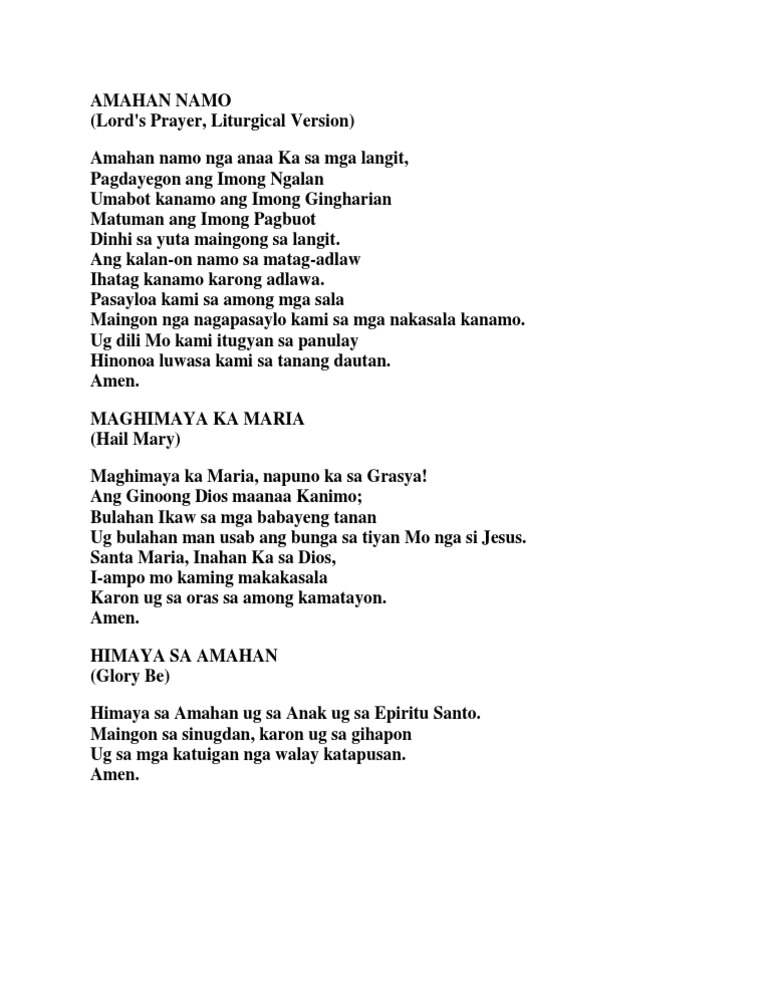 School Xavier University - Ateneo de Cagayan. Man usab ang bunga sa tiyan mo nga si. Maghimaya ka MariaHail Mary in Cebuano or BisayaMaghimaya ka Maria puno ka sa grasyaAng Ginoong Dios maanaa kanimoBulahan ikaw sa babaeng tananug bul.